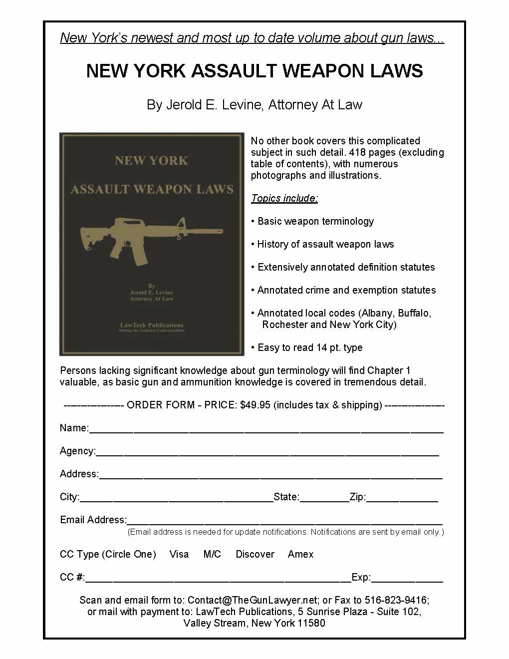 Mr. Levine's latest book, New York Assault Weapon Laws, has been published by LawTech Publications Company and now is available for purchase. The book contains detailed analysis of the New York assault weapon law, various local assault weapon codes, gun-related terminology, and is heavily illustrated with many photographs. It is a must-have resource for persons interested in this very complex and confusing legal subject.